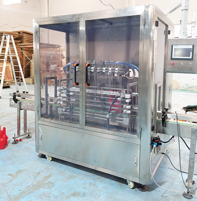 8头伺服式酱料灌装机是我公司的主打产品,主要是针对酱料等粘稠产品的包装、灌装设计的一种新型包装机设备,结构合理稳定,不易损坏,工作性能好,气动部分均采用德国FESTO和日本SMC的气动元件,气缸的活塞和缸体均由聚四氟乙烯和316L不锈钢材料制成,符合GMP要求,灌装量和灌装速度均可任意调节,精度高,灌装闷头采用防滴漏、防拉丝灌装装置,是豆豉酱、辣椒酱、辣椒酱等颗粒酱料灌装的最佳灌装生产线。目前,俄罗斯客户在我公司成功订购,经过我公司调试和安装,目前已经投入使用!